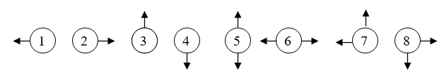 – M dòng tiếp theo mô tả qui luật truyền tin. Dòng thứ i trong số M dòng này chứa N số ai1, ai2, …, aiN, trong đó giá trị của aij sẽ là 1, 2, 3, 4, 5, 6, 7, 8 tương ứng lần lượt nếu ô (i, j) phải truyền tin cho ô kề cạnh bên trái, bên phải, bên trên, bên dưới, bên trên và bên dưới, bên trái và bên phải, bên trên và bên trái, bên dưới và bên phải (xem hình vẽ); còn nếu ô (i, j) không phải truyền tín hiệu thì aij = 0.
