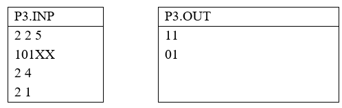 Kết quả: Ghi ra file văn bản P3.OUT gồm M dòng, mỗi dòng là một xâu gồm N ký tự 0 hoặc 1 mô tả trạng thái của lưới sau nhịp thời gian thứ T.