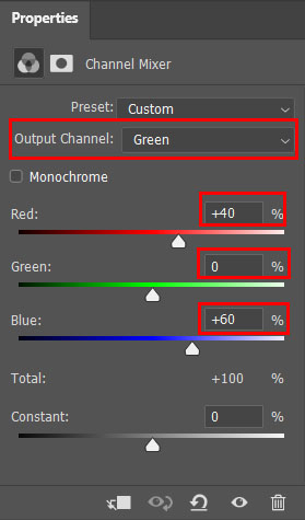 Trong bảng thoại Channel Mixer… phần Output Chanel, chọn màu Green với các thông số như hình dưới đây: