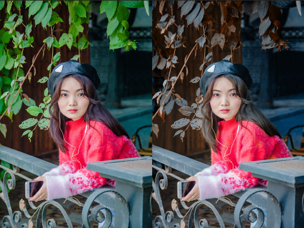 Kết quả sau khi blend màu (bên trái là ảnh gốc, bên phải là ảnh sau khi blend màu). Phần gương mặt và áo đã được lấy lại qua lớp mặt nạ với công cụ Brush: