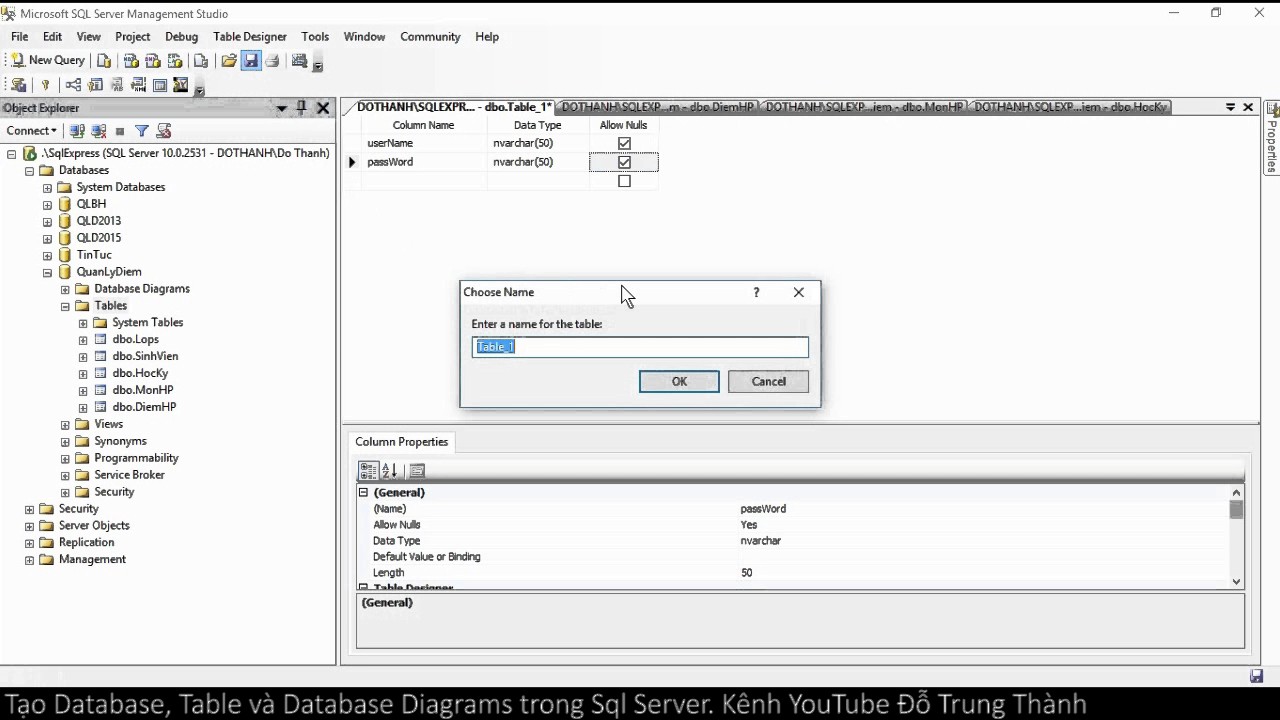 XD phần mềm quản lý điểm: Bài 1 (bổ sung). Tạo Database, Tables va Database Diagrams