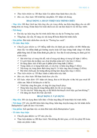 - Nội dung: GV yêu cầu HS thêm hiệu ứng động, hiệu ứng chuyển trang cho bài trình chiếu